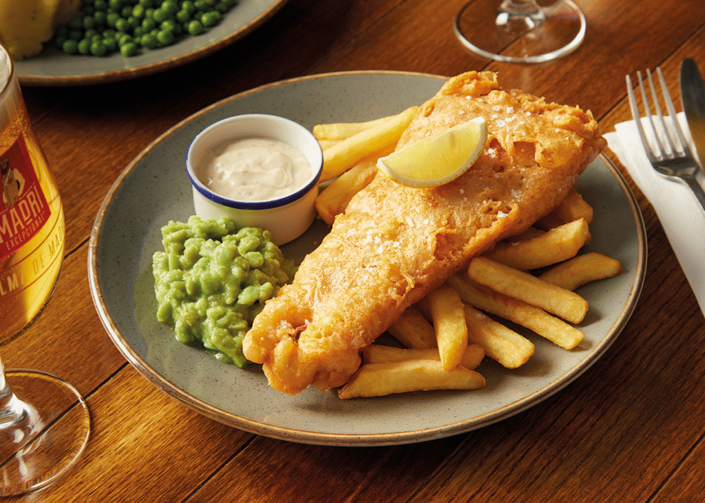 Beer-battered fish & chips, with your choice of garden or mushy peas (†) | 12.29 1095 kcals