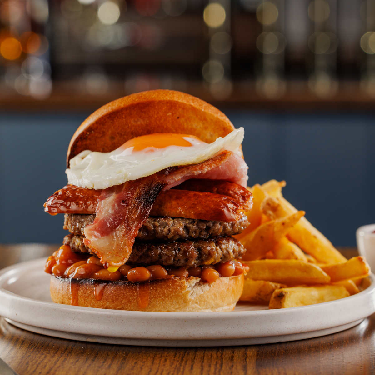 All day breakfast, two pork sausages, two bacon rashers, two free-range fried eggs, grilled tomato, mushrooms, chips and baked beans | 12.29 1270 kcals